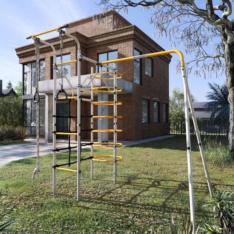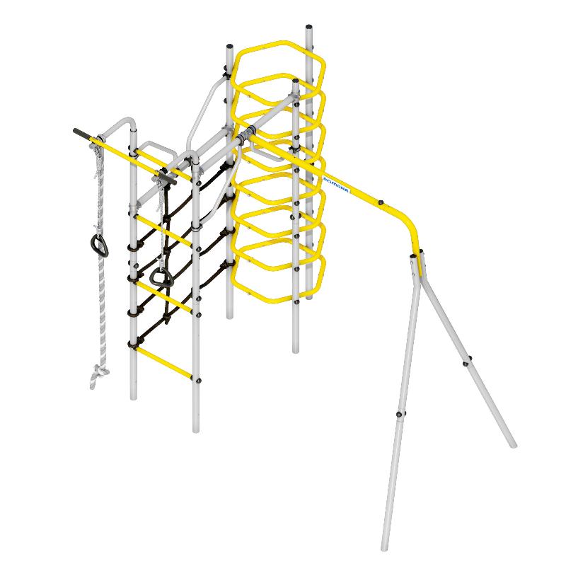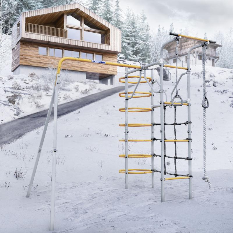 В состав комплекта ROMANA Космос входят: кольцевой лаз, турник, сетка лаза, канат, кольца, и качели на выбор. Каркас комплекса выполнен из прочного металла и выдерживает нагрузку до 100 кг, а навесное оборудование – до 50 кг. Установка комплекса осуществляется методом бетонирования на специальные закладные конструкции. Площадка для монтажа должна быть ровной и не менее 7550*4400 мм в размере. Навесное оборудование устанавливается только после полного застывания бетона.