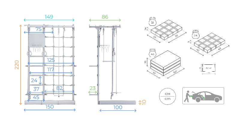 Домашний спорткомплекс с классическим методом крепления к стене (с помощью кронштейнов) характеризуется универсальностью. Он подойдет для частного дома или квартиры. Габариты конструкции комплекса 863х1540х2196 мм, с турником и рукоходом без регулировки высоты. Общий вес основного комплекса – 32,1 кг. Максимальная нагрузка – 100 кг, для навесного оборудования – до 50 кг. Ступени массажные, что исключает скольжение в процессе эксплуатации.