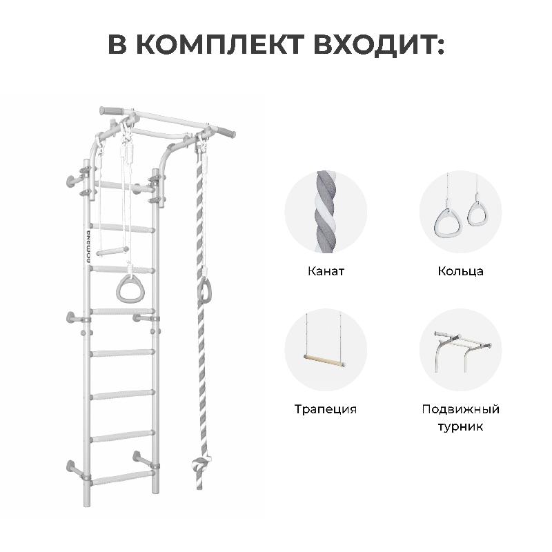 Детский спортивный комплекс ROMANA Next Top способствует гармоничному развитию всех групп мышц у ребенка, обеспечивая при этом профилактику плоскостопия благодаря наличию массажных ступней. С допустимой нагрузкой до 100 кг и возможностью использования различных навесных элементов с нагрузкой до 50 кг, он предоставляет широкие возможности для разнообразных упражнений. Детский спортивный комплекс ROMANA Next Top предлагает уникальную возможность крепления к любой стене, обеспечивая высокую универсальность использования. Компактные размеры делают его идеальным выбором для установки в квартире.