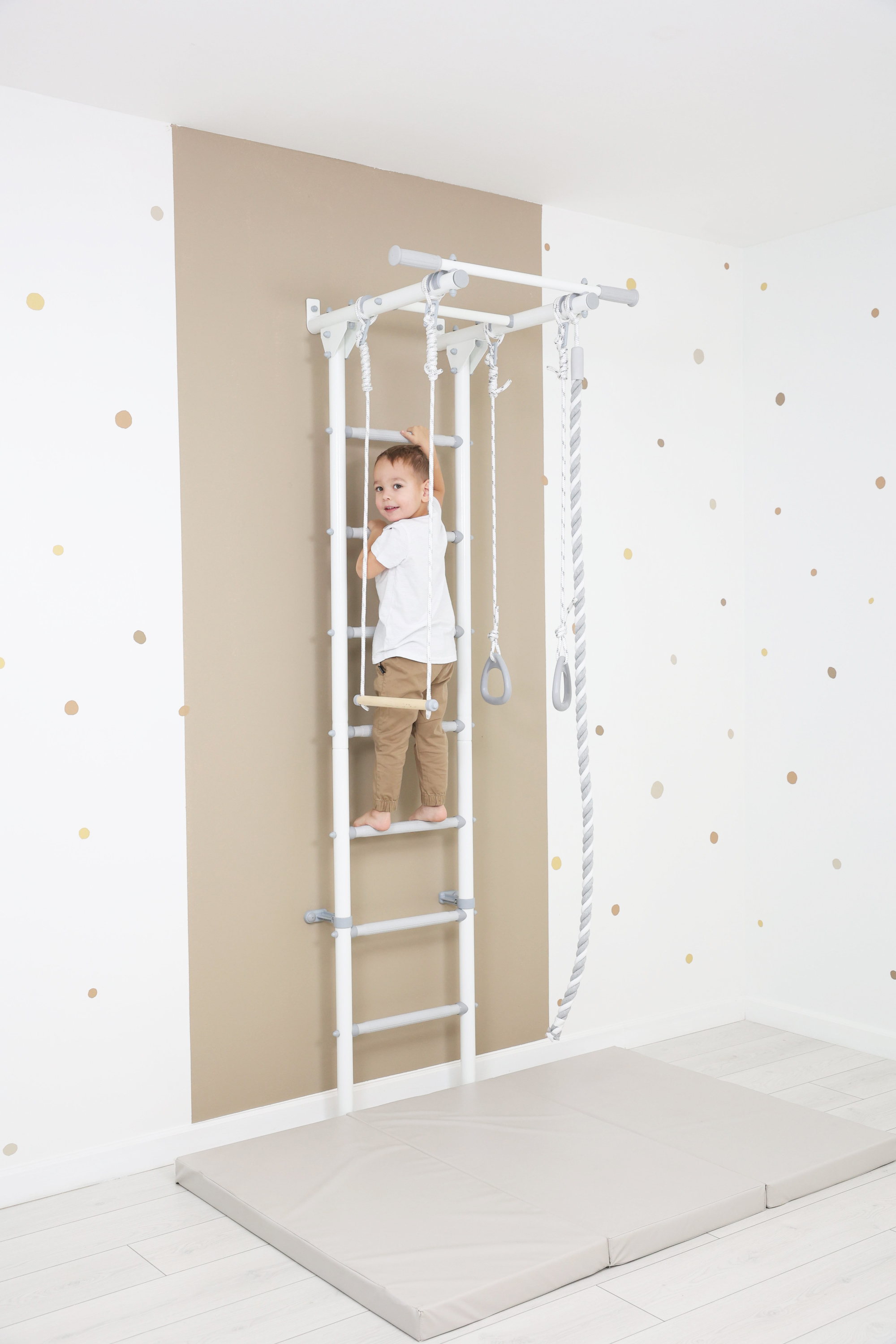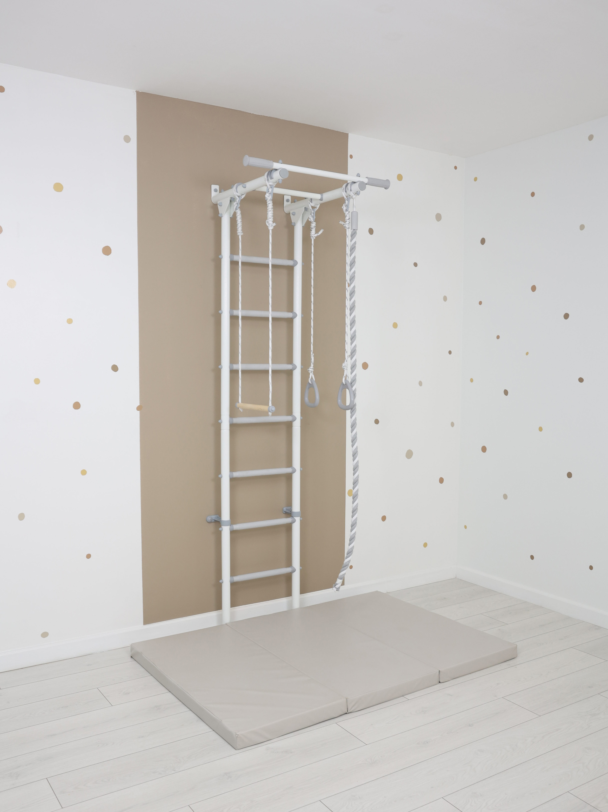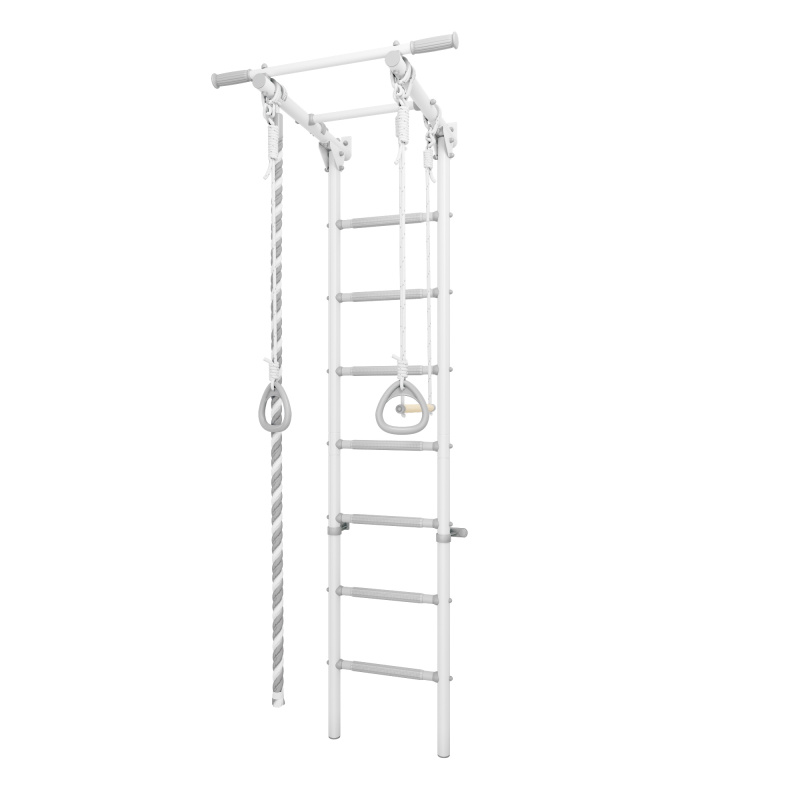 В комплект спортивного комплекса входит дополнительное навесное оборудование - канат, гимнастические кольца и трапеция. Эти элементы разнообразят комплекс упражнений и являются отличными элементами активной игры для детей.