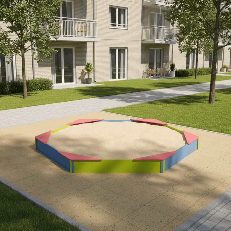 Песочница для детей от 3 до 7 лет. Может эксплуатироваться круглогодично во всех климатических зонах.Изделие представляет собой разноцветную песочницу размерами не менее 2850*2500 мм, состоящую из не менее шести металлических стоек, которые должны бетонироваться.