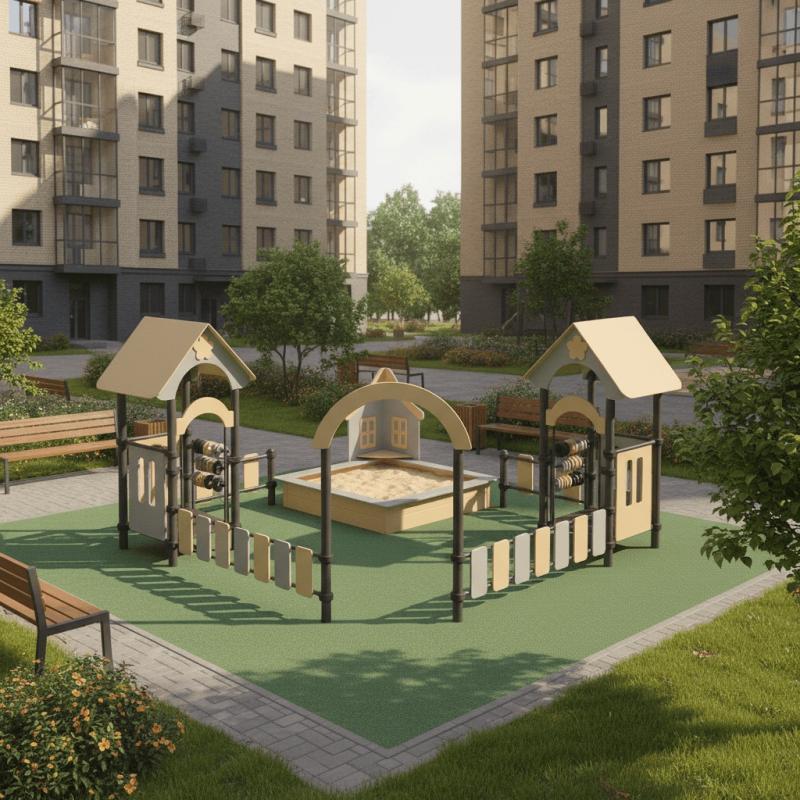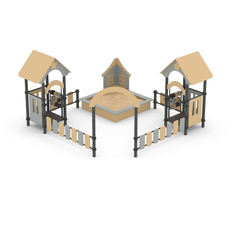 Песочный дворик – это яркий игровой комплекс с песочницей и домиками. На домиках установлены счеты, которые помогают развивать мелкую моторику и учится счету. Игры с песком так же развивают мелкую моторику, фантазию и усидчивость. Может устанавливаться на любых площадках. Является не только практичным игровым оборудованием, но и эстетически красивым украшением площадок.