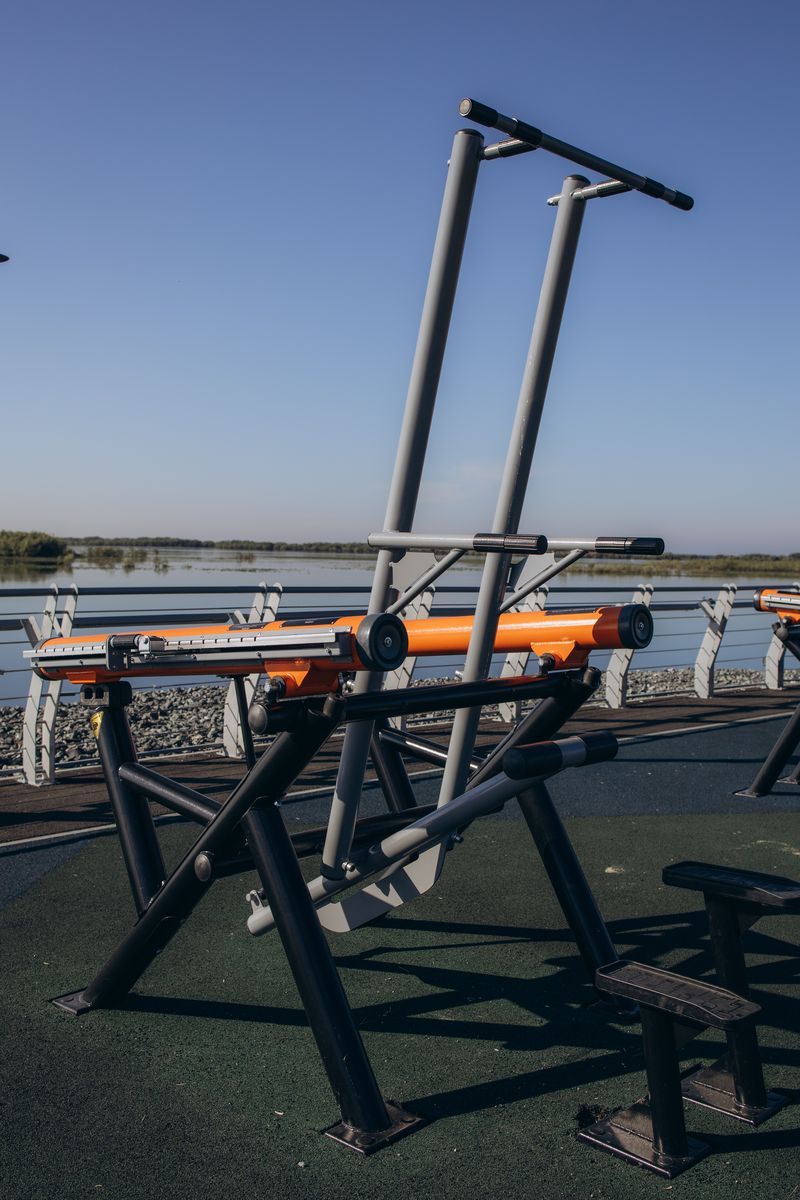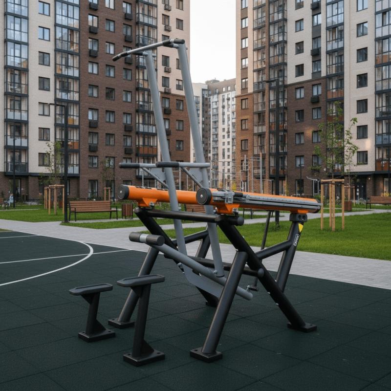 Уличный силовой тренажер «Гравитрон» позволяет выполнять отжимания на брусьях и подтягивания широким и узким хватом даже новичкам.